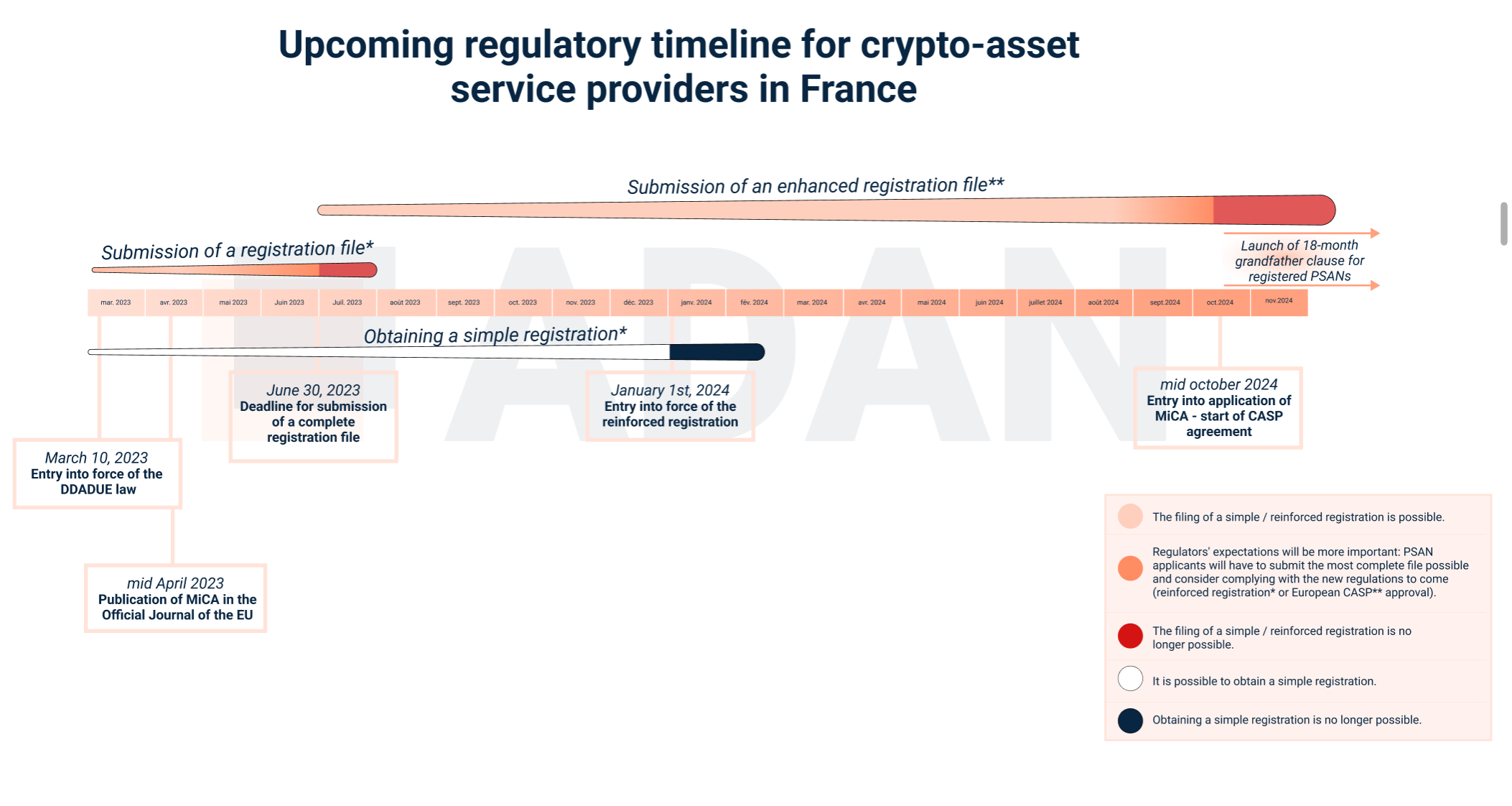 The provisions resulting from the DDADUE Act are part of a reflection initiated, following the bankruptcy of the FTX platform, on the regime applicable to registered PSAN. These provisions also take into account the forthcoming publication of the European Regulation on Markets in Crypto-Assets (“MiCA”), which proposes a harmonisation of the regulation applicable to the provision of services on crypto-assets in the Member States of the European Union.