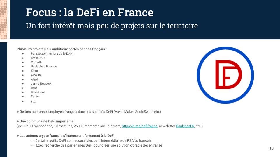 Cela se confirme lorsqu’on observe le nombre de projets DeFi d’ampleur internationale portés par des français – on compte plus d’une dizaine de sociétés du secteur dont les fondateurs sont français. On constate également que de nombreux français présents dans les équipes des plus importants projets DeFi de l’écosystème. On regrette cependant que peu de projets existent sur le territoire français, un symptôme du cadre réglementaire peu favorable au développement d’un écosystème concurrentiel.